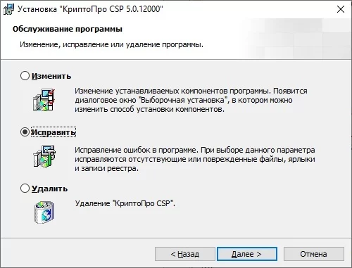 2. запускаем инсталляцию CSPSetup, выбирая «Исправить», перегружать ничего не нужно!