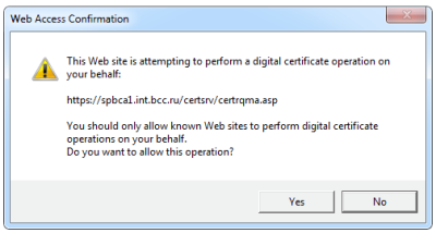 1. На компьютере пользователя, используя браузер Internet Explorer (другие браузеры могут не работать), добавить сайт https://spbca1.int.bcc.ru/certsrv в доверенные узлы.
