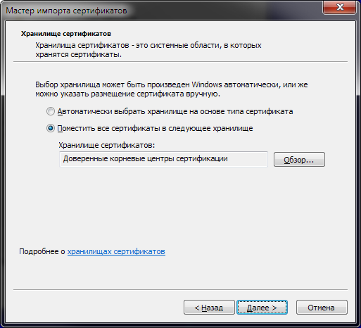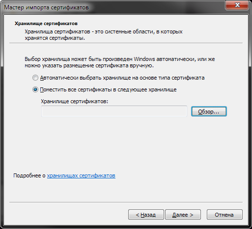 Вместо «Автоматически…» выбрать пункт «Поместить все сертификаты в следующее