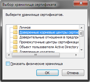 Выбрать «Доверенные корневые центры сертификации», нажать «ОК»: