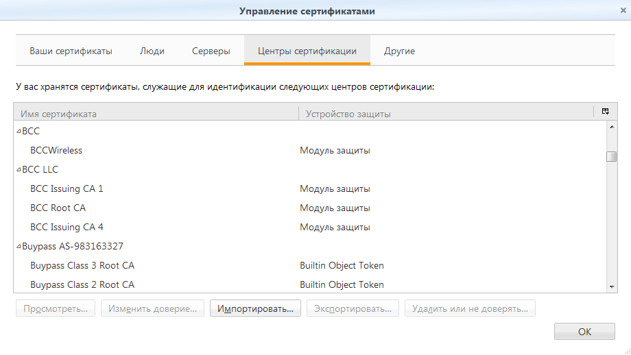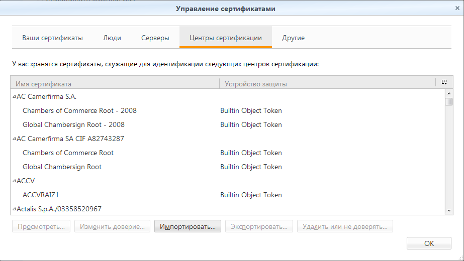 По окончании загрузки список центров сертификации будет выглядеть следующим образом: